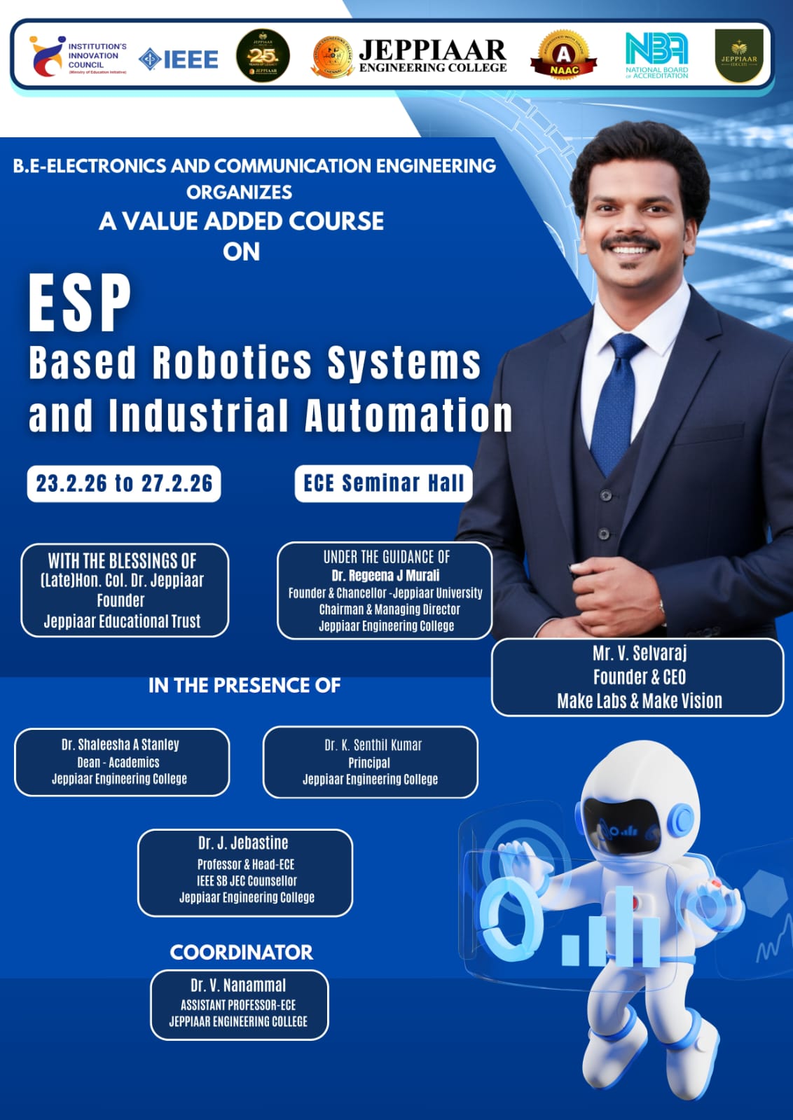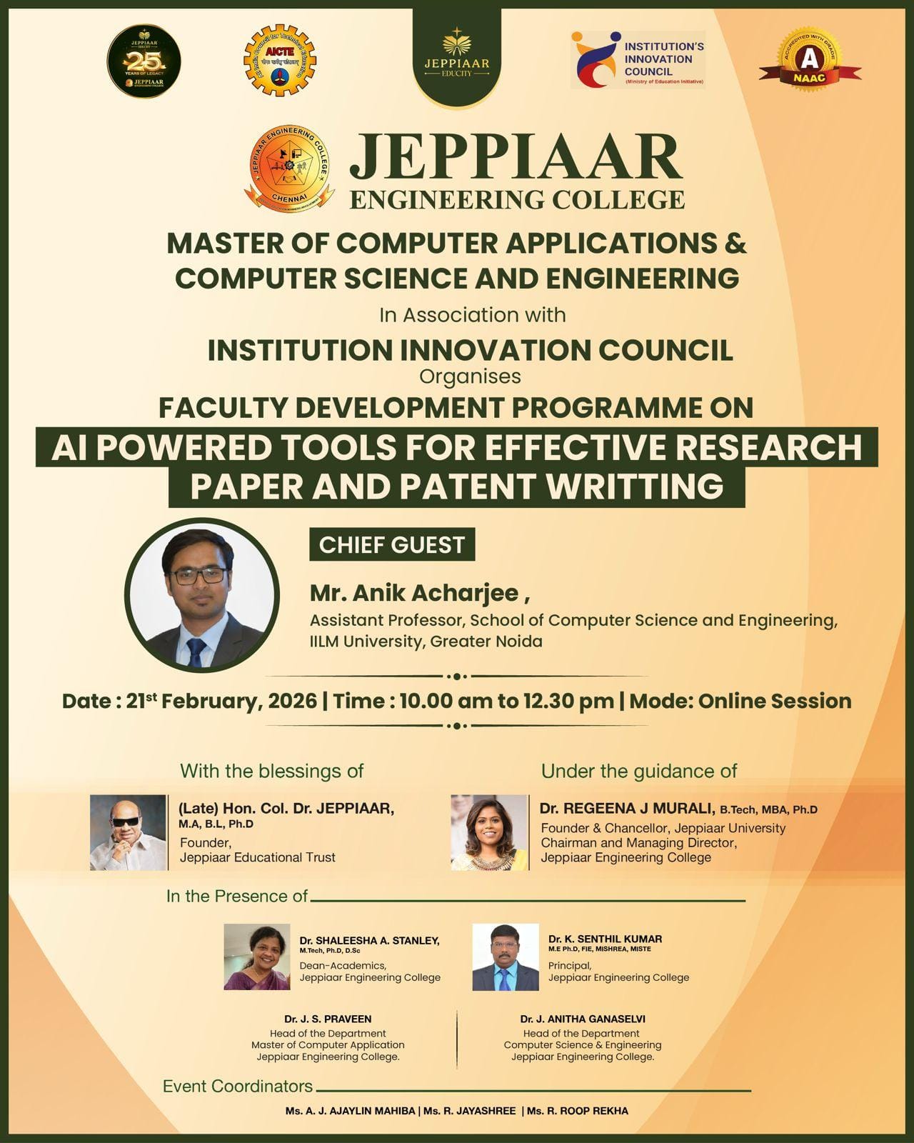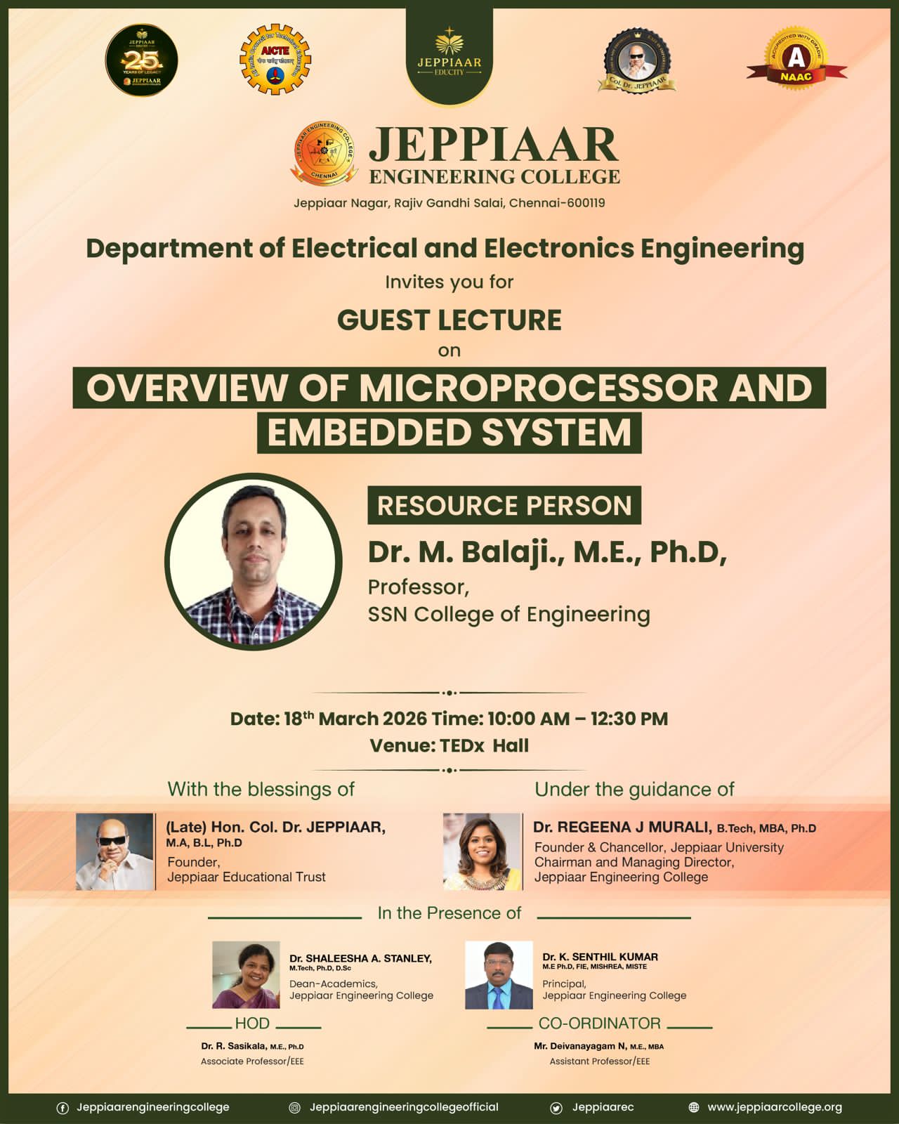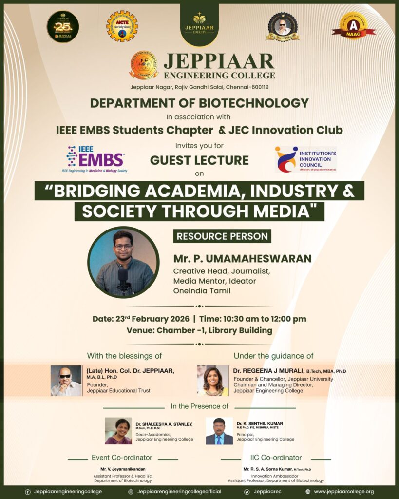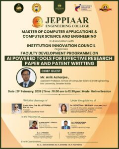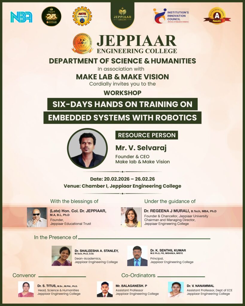 Jeppiaar Engineering College aims at the complete development of the student and our staff is hand-picked and trained to ensure that the students are given every possible support in all their pursuits, academic or personal.