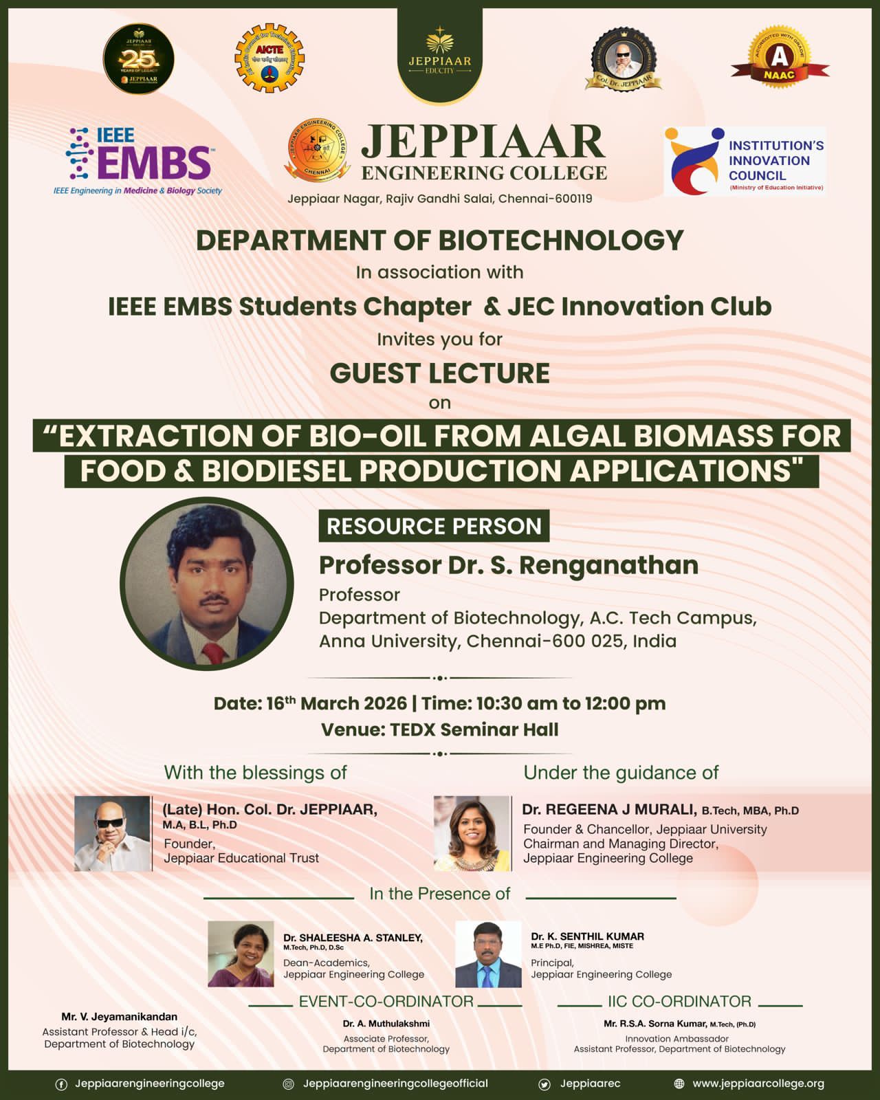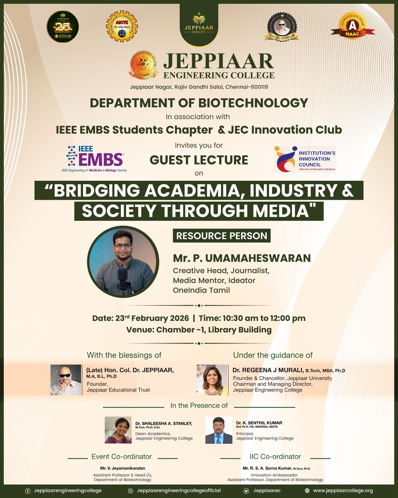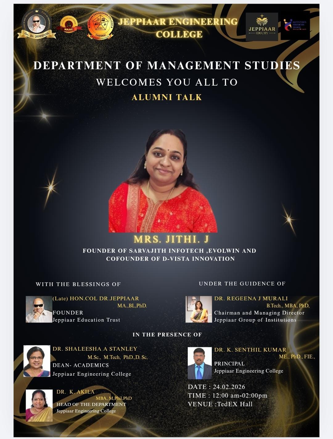 Col. Dr. Jeppiaar, M.A. B.L., Ph.D., the Founder and Chairman of Jeppiaar Educational Trust and the Founder Chancellor of Jeppiaar Engineering College. He started his career as a Police man and by virtue of sheer hard work and ability rose to prominence, which a very few can match in the field of education.