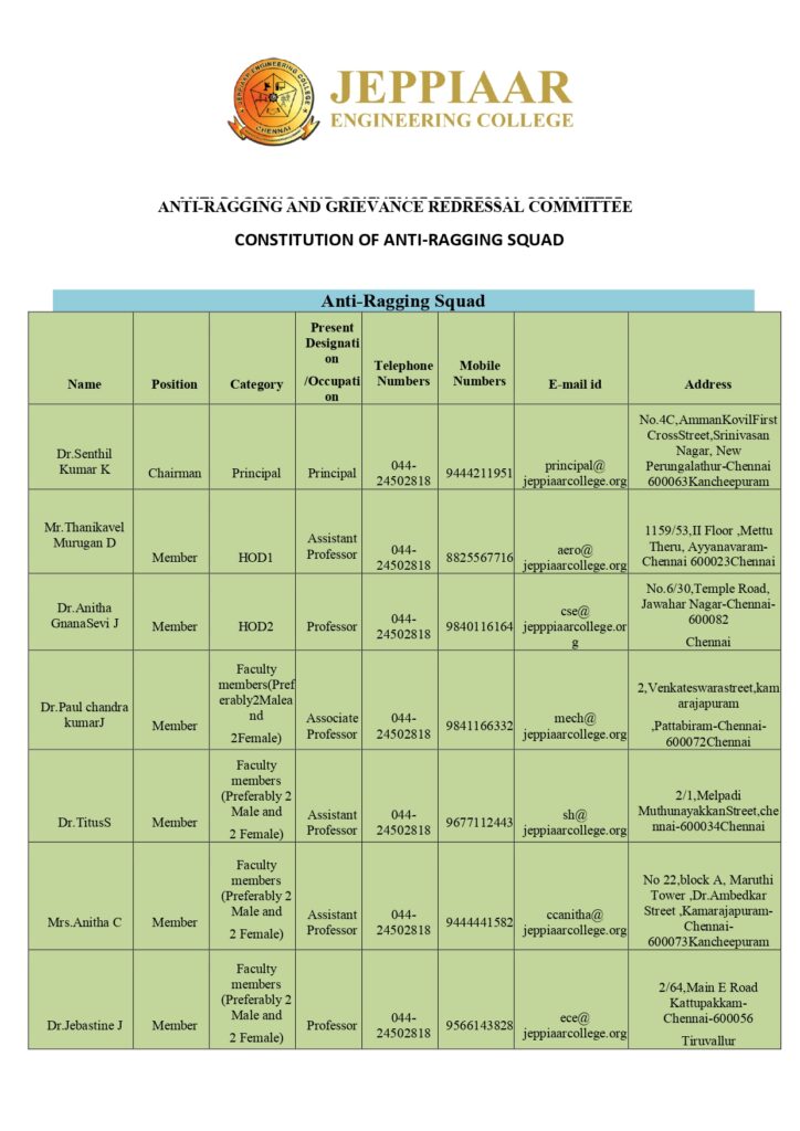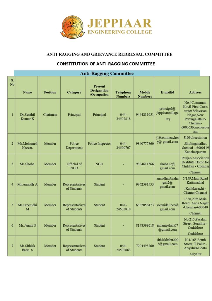 You can also use this email for ragging related complaints contact: antiragging@jeppiaarcollege.org