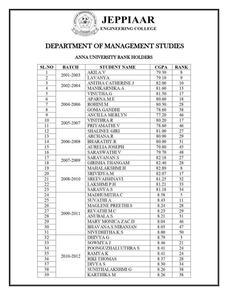 Our faculty members published many research papers in various National and International Journals and Conferences. They guide the students both in academics and non-academic activities to mould our students to become successful in their career developments. We offer all electives offered by the Anna University such as Human Resource, Marketing, Finance, Operations and business analytics. The Department has given consistently the University result of 95% & has produced a total of 2000 successful MBA graduates in the last 21 batches along with 78 University Ranks including 1 Gold Medal.