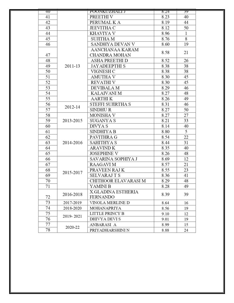 - Secured 78 Anna University Ranks including one Gold Medal in 2011-13 batch by Ms Khaviya